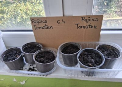 Učenici 6.b , 7.a i 7.b razreda koji njemački jezik uče kao drugi strani jezik posijali su i ove godine svoje rajčice i paprike. Nastavnica njemačkog jezika, Mihaela Hutz, provodi s njima već tradicionalno tijekom veljače i ožujka radionice za učenje stranog jezika uz praktični rad odnosno uzgoj presadnica.