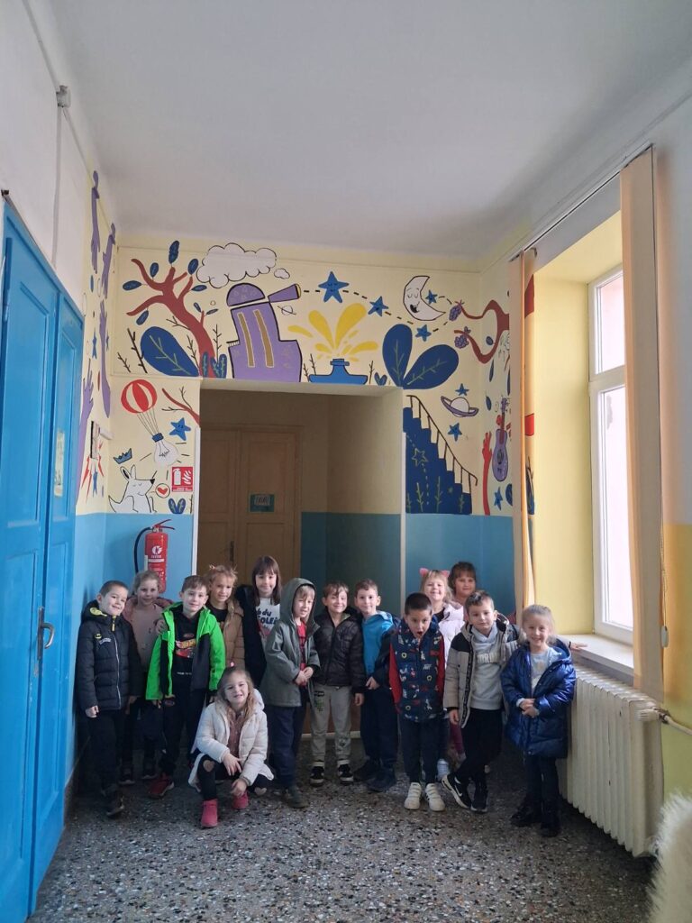 Skupinu Žabice pozdravila je i ravnateljica škole Branka Sironić Buić, a pri kraju posjete djeci je pokazan i mural kojeg su izradili bivši učenici škole Vibor i Vjeran Juhas u suradnji sa Sa(n)jmom knjige u Istri.